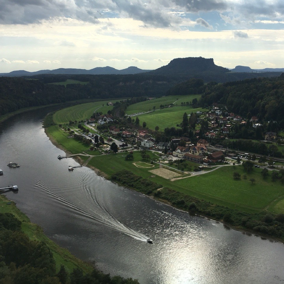 Meag: Last night, Matt gave us directions to go to Basteibrücke by train. We didn’t really know where we were going but we hopped on the train in the morning and rode through a little valley with picturesque colourful houses along the Elbe River. After about half an hour, we got off and walked down to the waterfront where a small ferry was tied down and to float back and forth across the river. I tried my hand at some more German to get tickets and the boat captain got what I meant after some hand gesturing. (S: and some unhelpful hand waving on my part.) We wound our way through the little streets to find the bottom of what was essentially a giant 60-minute staircase, which Savanna was thrilled about!