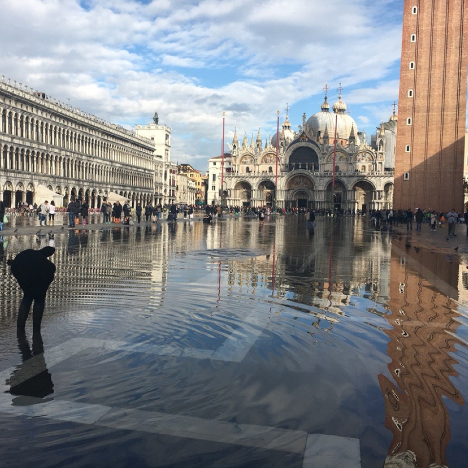 S: Yesterday I mentioned that sections of streets are sometimes blocked off because there is water lapping up onto them, but today was a whole different story! The street we needed to use was so flooded that only people with rain boots could cross it. After a quick detour we made it to Piazza San Marco… Which was also flooded. We had to skirt around the left side because the middle and right sides were entirely un-walkable for anyone in regular shoes.