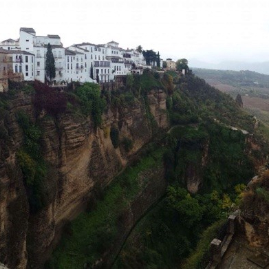After a nice slow morning we headed off for Ronda, a little town further up in the hills. The drive was very foggy and cloudy. We could see some of the villages we drove by, but nothing past them as the valleys were completely full of fog. The villages were full of white houses built into the hillsides surrounded by olive and chestnut trees, with a few sheep and goats grazing near the road. When we got to Ronda the clouds lifted ever so slightly and the rain slowed down to a drizzle. I hopped out of the car and walked around the bridge across the big gorge. It was quite a drop. Not sure about the accuracy of this story, but I heard that Franco threw nuns off the edge of the gorge during the civil war. The town is steeped in history having had so many different people living there, from Phoenicians to the Romans, to the Moors, then the Spanish. You can see all these different influences, particularly the last two, throughout the town. There’s only one tiny Mosque, but even the churches have a bit of a Moorish flair to them.
