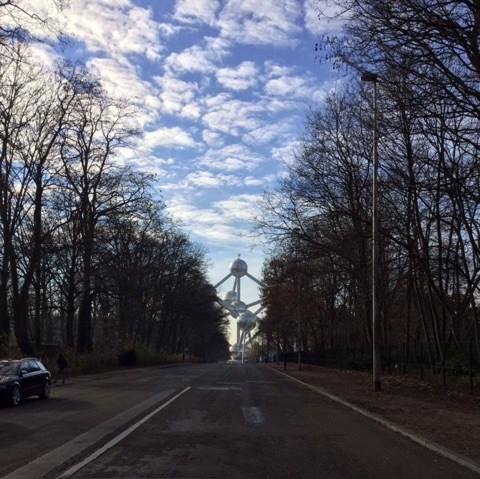 We had a couple things we wanted to see that were out of the city centre, so we figured we’d get them both done today. Half an hour on the train later and we arrived at what appeared to be the outskirts of Brussles. Walking across the highway overpass we read the “Please come again soon!” sign and realized just how far out we’d come. Then we turned around a corner and in the distance loomed the Atomium. Where the Manneken Pis was surprisingly small even when we were expecting it to be small, the Atomium was surprisingly big even with our big expectations. The giant silver balls of the Atomium reflected the clouds and the bright blue sky. This is one of the things we haven’t really researched before seeing, so we walked up to it and kept asking ourselves “Why?” Once inside (we didn’t even know we could go inside!), we learned the answer to our big “Why” question – it was built as part of the 1958 World Expo in Brussels. The exhibit talked all about the design of the Atomium and the Expo, too. We perused the displays and took in the view from the top floor before heading down to check out our next stop for the day.