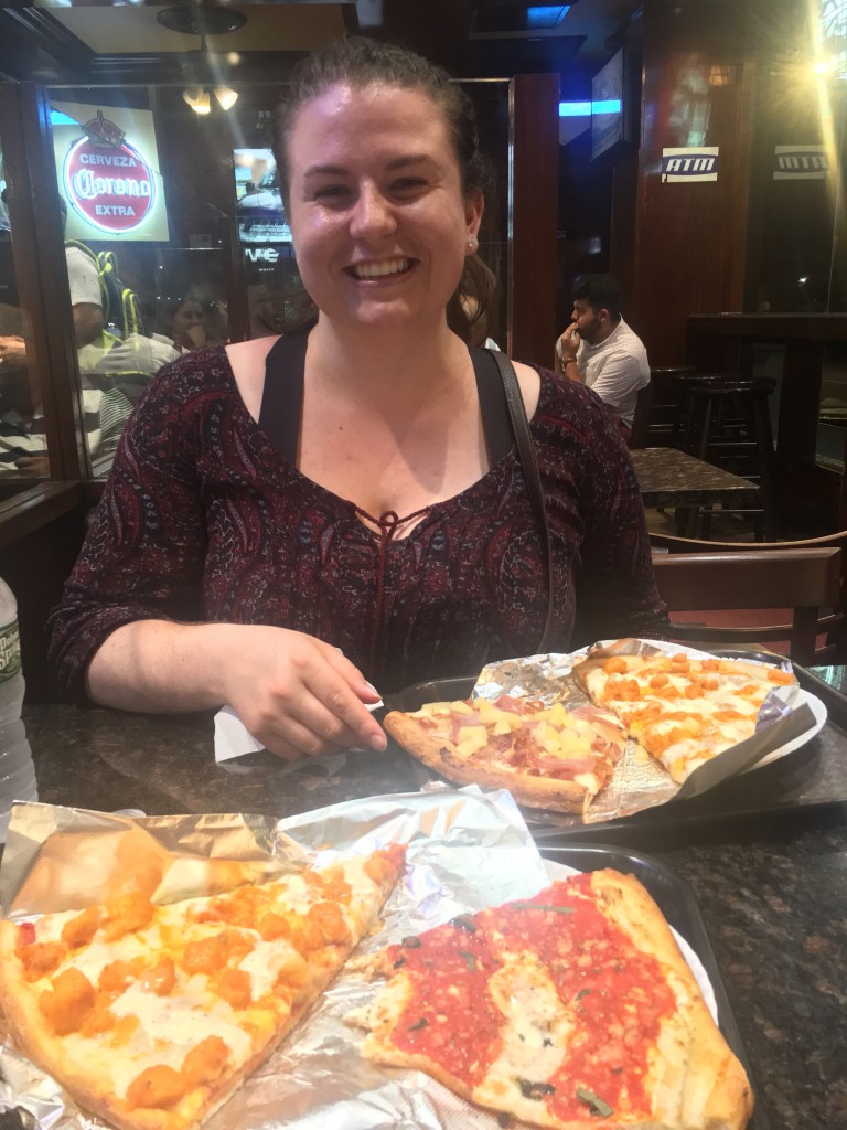 We walked back towards Time’s Square, stopping for pizza along the way at a shop that must have had 20 different pizzas you’d buy by the slice. We ordered what we thought was butter chicken pizza (it was actually buffalo chicken. Oh USA) and caught up on everything we’ve missed since we spoke last.