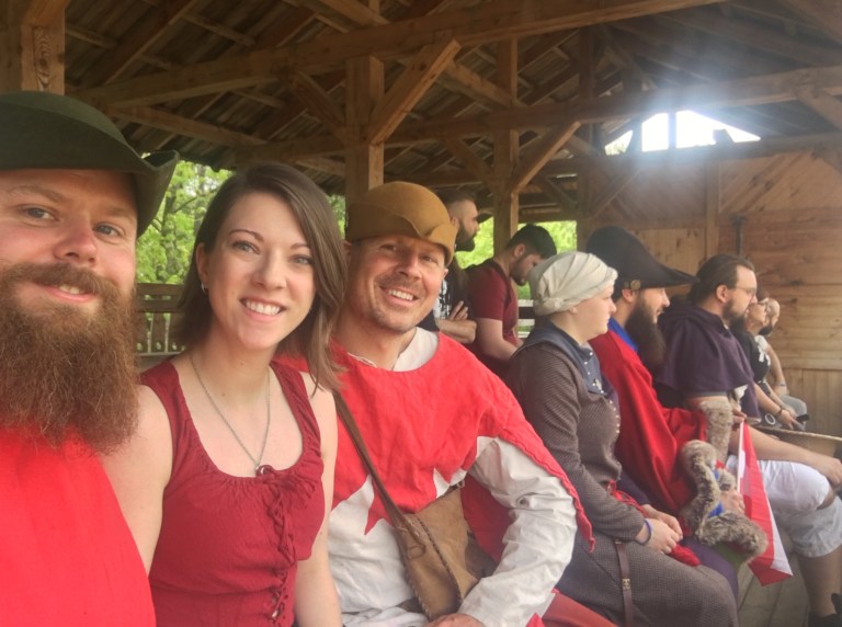 Mack’s Polearm fights started at 10, so we all got ready to watch him from the giant wooden stands. He made it out of his pool after fighting 4 fights and would be fighting again this afternoon. We all rushed from the pole arm fights to gear up in armour for the opening ceremonies. I had a bit of an emotional moment when the team helped me into my Canadian surcote. I was representing Canada in a sport. There’s a feeling that comes with that that’s hard to describe in words, but it was pretty humbling. Time sort of stopped around me as I adjusted my belt and looked around at my team.