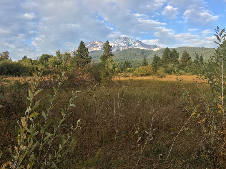 For almost two hours we had the massive Mount Shasta volcano as a backdrop to the chaparral all around us. As the sun went down opposite the mountain, the snow at the peak turned pink and we entered a very thick, and very dark forest…