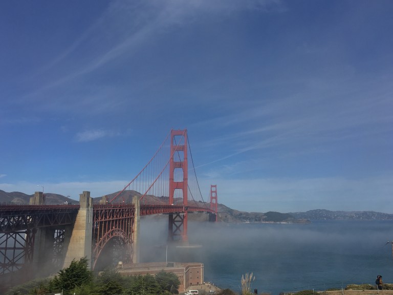The bridge was beautiful from afar, but as soon as we got close up a fog rolled in from the ocean and obscured the entire thing. I was genuinely disappointed at first, until we started walking across and I realized that only one side was covered in fog! Yay! We emerged into sunshine that was so bright we could barely keep our eyes open for photos. See below.