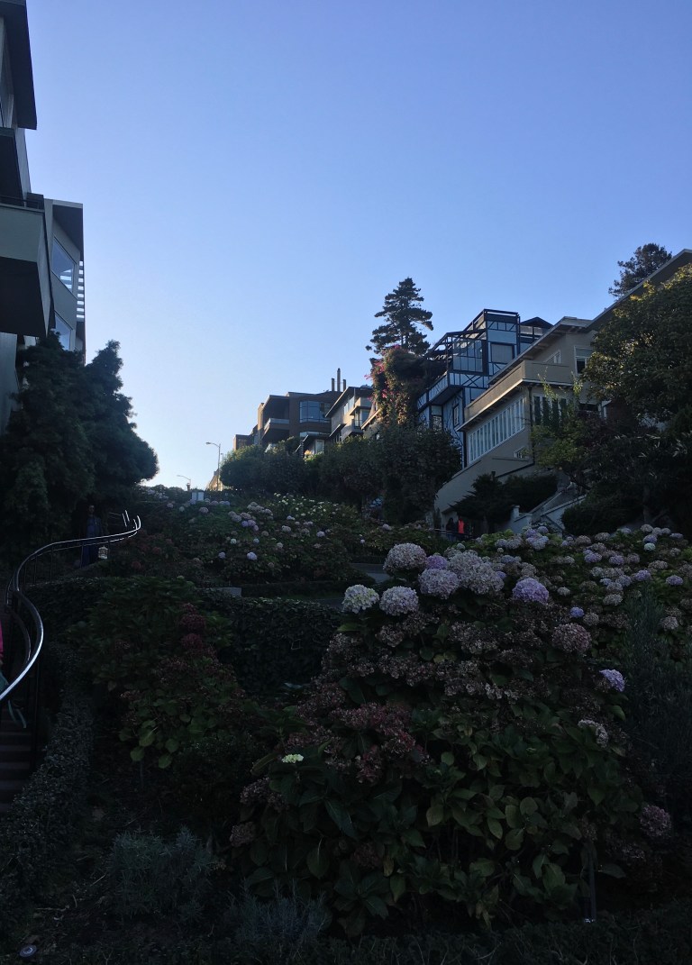 We decided something a little lighter was in order after this tour, so back on the mainland we meandered through the very touristy Fisherman’s Wharf, over to Ghirardelli Square and up up up to the top of Lombard Street. Lombard street claims to be the most photographed (and crookedest!) street in the world. The road was basically all switchbacks and hairpin turns that cars had to manoeuvre around, lined with bright flowers and beautiful Victorian houses.