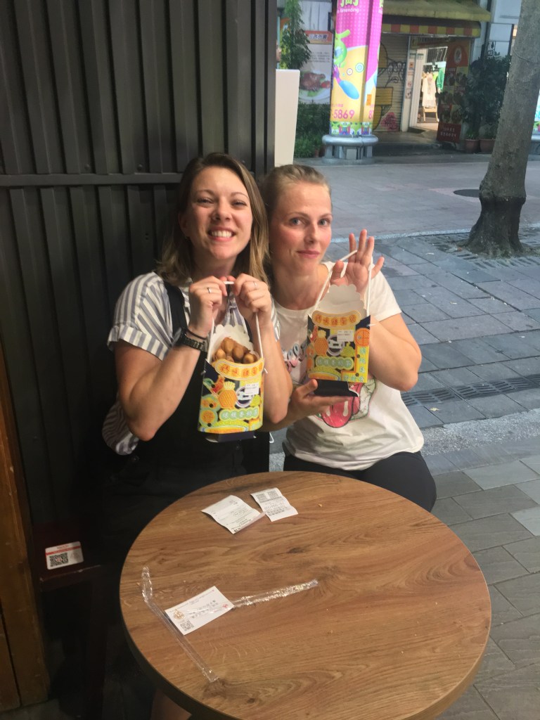 I hopped a train back to the hostel and met a couple new Canadians in my room: Justin and Terrence. The three of us went downstairs, met Matt, Helena, Jack, Zach and a few others. We all sat around visiting with a beer, and talked for quite awhile about how we all ended up in Taiwan, of all places. Eventually we wandered down the street in search of dumplings (they were tasty but not as good as Din Tai Fung) and bubble waffles. Bubble waffles look like waffle batter bubble wrap with each bubble filled with something of your choosing. I stuck with good old fashioned chocolate to be on the safe side. Also they come in a cardboard purse?
