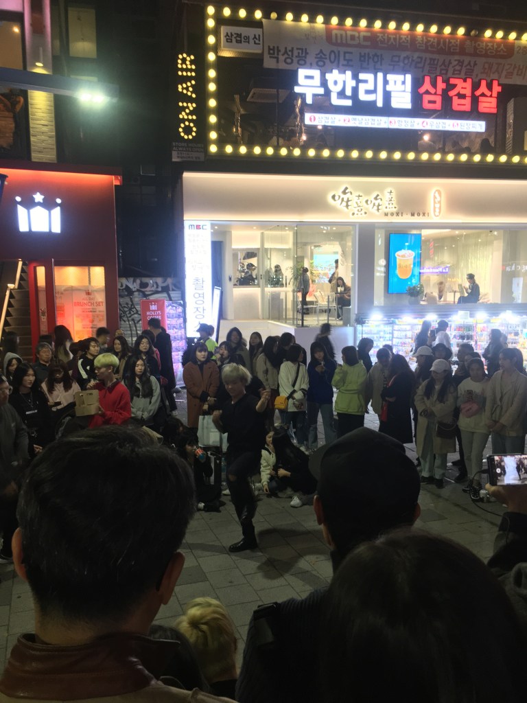 I wandered far enough to find a plug-in converter for sale (as I hadn’t thought of that before I left), and some more versions of the bbq chicken, before deciding to head back towards the hostel. I didn’t want to venture too far with a dying phone and no real idea of the workings of this city on a Saturday night. I passed by many karaoke singing acts along the way, as well as a number of KPOP dance circles that were actually impressive and entertaining to watch!