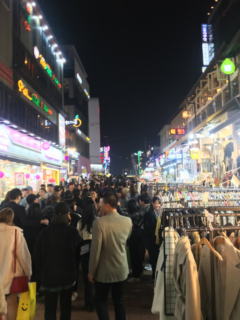 There were food stalls all down the middle of the street, merchants shouting and selling what seemed to be Korean barbecue chicken on a stick (can confirm it was super tasty). There were countless beauty and fashion shops spilling their wares out on to the street, everything on some kind of sale or another. It’s a good thing I don’t have any room in my bag because the amount of stuff I wanted was astronomical. Every kind of fashion you can imagine is available on this street. I might have to get something interesting and small!