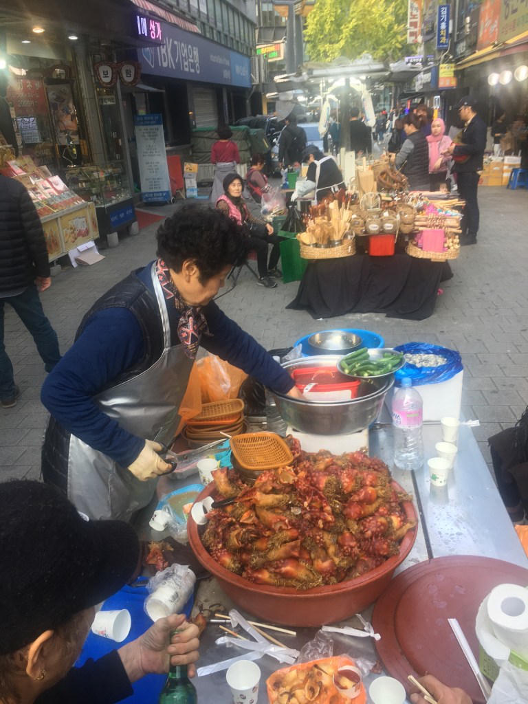 I walked down to Namdaemun Market, a busy few streets filled with Korean food stalls and fake brand name merchandise. I seriously laughed at a few stalls because someone is buying enough of this stuff to keep them in business. Gucci underwear? YSL socks? You got it, for only a dollar. I wandered the stalls, paying particular attention to what food was being sold the most, as that’s a pretty good indicator that I should try it at some point. There were huge green or red pancakes everywhere, sticks of squid, and tons and tons of meat slathered in bbq sauces.