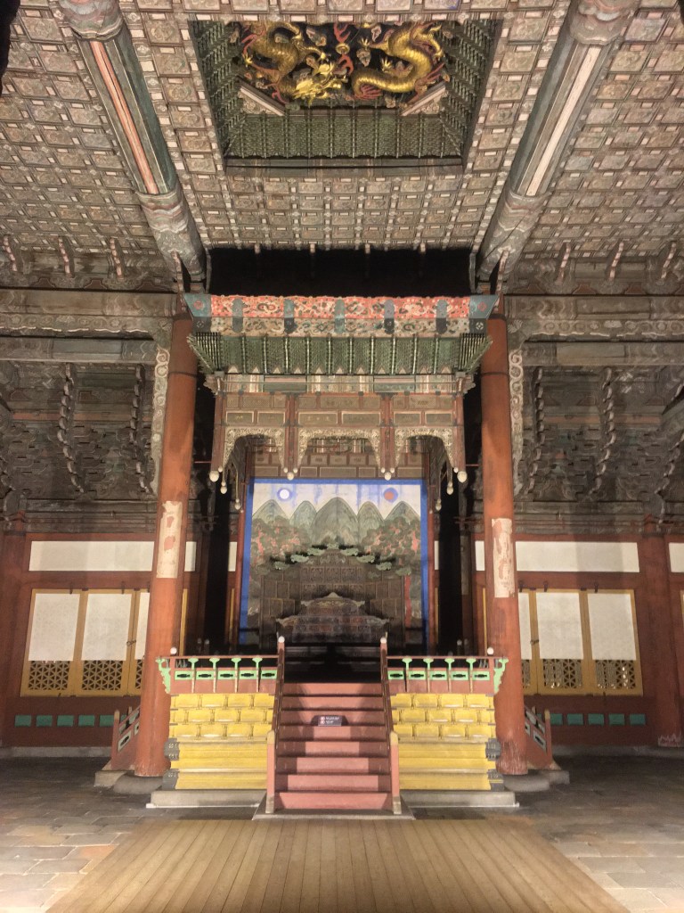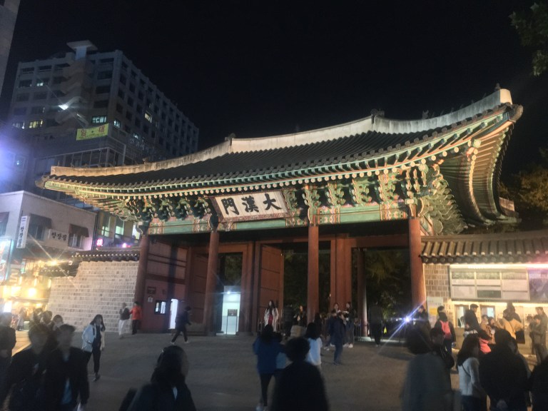 It was still pretty early (too early to go home to bed!) so I walked over to Deoksugung Palace (Once again, it was a point of interest on the map). It was dark out but the low buildings were lit up beautifully, and I could see the painted details of the underside of the roof extremely well. The whole complex was made up of old red and green and beige Korean buildings built originally in the 13th century, flanked by Western European ones built by King Gojong in an attempt to ‘modernize’ in 1900.