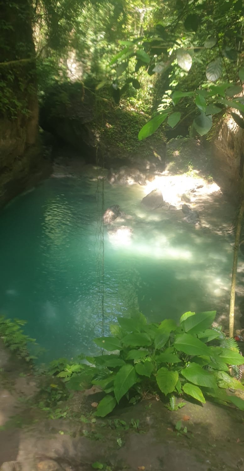 Huge stalactites dripped into the rushing bright blue water below. Vines and trees overhung the canyon walls, draping down into the space. Little fish swam all around and we picked our way through for four hours of fun. The second cliff was seven meters high, in this thin little section where the guide says ‘don’t jump too far or you’ll hit the wall’