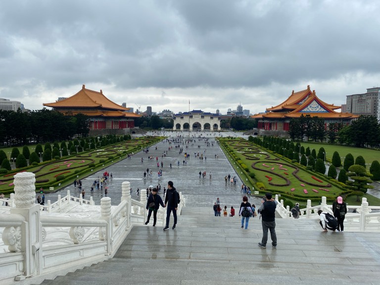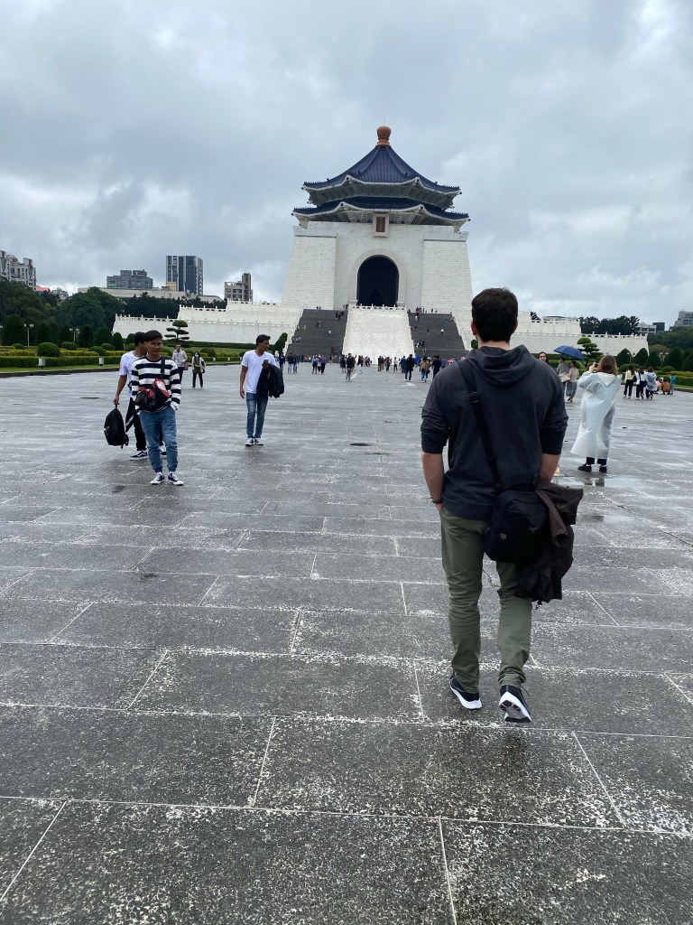 It was raining outside pretty hard so we started the day with a game of crib, before deciding we could handle a bit of water on the way to our first stop: the Chiang-Kai Shek Memorial. We stepped out of the subway station and directly in front of us was the massive national theatre. A sloped yellow roof with a green and blue underbelly was held up by thick red pillars. I kept a close eye on Max for this visit because I remembered the sobering feeling I had myself when rounding the corner of the theatre to see the courtyard of the memorial.