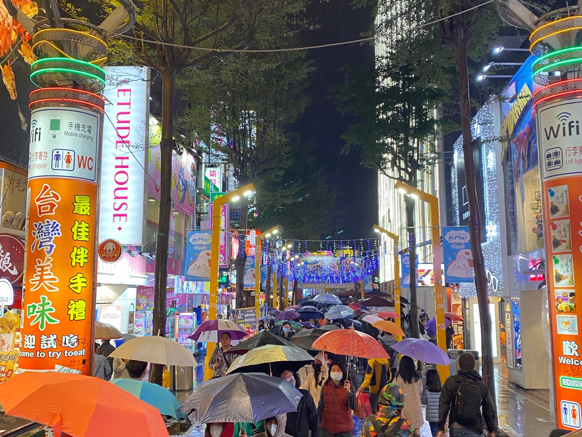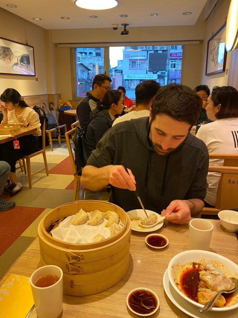 We shook off some of the heaviness and the rain by popping out our umbrellas and strolling through Da’an Forest Park. We stopped into Din Tai Fung (the mother of all dumpling restaurants) beforehand to grab a number for the two hour (!) lineup. An hours walk all the way across the park, with a stop under a stone pavilion for a couple more rounds of crib was the perfect way to spend the time. Very few people milled about as the rain poured down, and Max even almost had an extremely fat squirrel eating out of his hand.