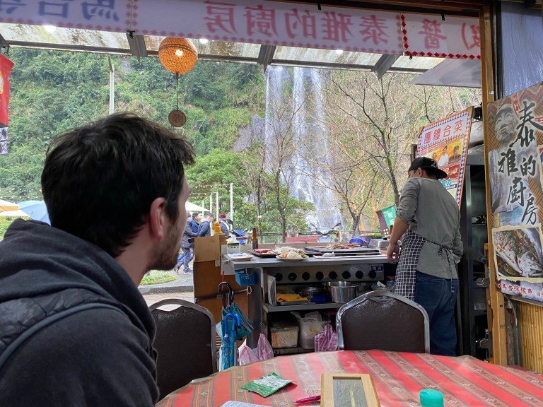 The small streets were lined with traditional food stalls and aging brick or wood buildings. The whole thing very much reminded me of a less touristy Skagway in Alaska. Taiwanese style. Just the feeling was happy and quaint for sure. At one point we found ourselves in a lineup for a little log cart that chugs up the mountain towards a tall multi-step waterfall, in front of which you can have lunch or coffee (we opted for the former). We laughed the whole way up and down, chilly but so surprised we had found this silly little cartoonish cart to ride in.