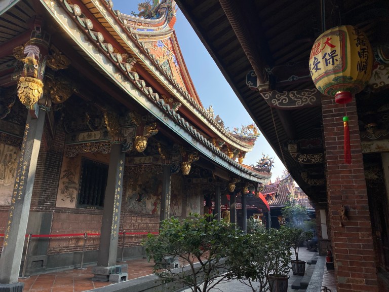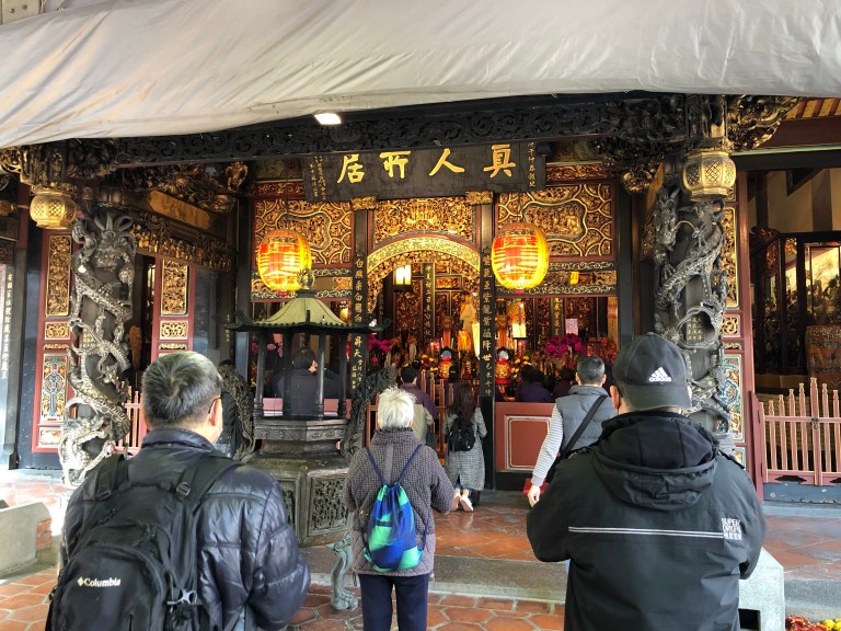 We dodged some scooters as we crossed the street and arrived at our next stop: Dalongdong Bao’an Temple. We entered a courtyard with an enormous inflatable rat display and were reminded that we are still in the middle of the Chinese New Year (year of the rat). Elaborate gates led into the main area, which housed the most beautiful temple I’d had seen yet (and it also happened to be the least crowded we’d been to). A dozen or so purple-robed singers were inside the temple, humming and playing instruments which really added to the atmosphere. We even has some one-on-one time with a few of the deities and I felt pretty lucky. Zhōngguó mínjiān xìnyǎng, the traditional Chinese religion, seems to focus heavily on being virtuous in your day to day actions and enriching your life. Sav and I spent a lot of time talking about religion after this temple, discussing our feelings about what we’d learned. All this hard thinking got my stomach grumbling again and we went on the hunt for food once more.
