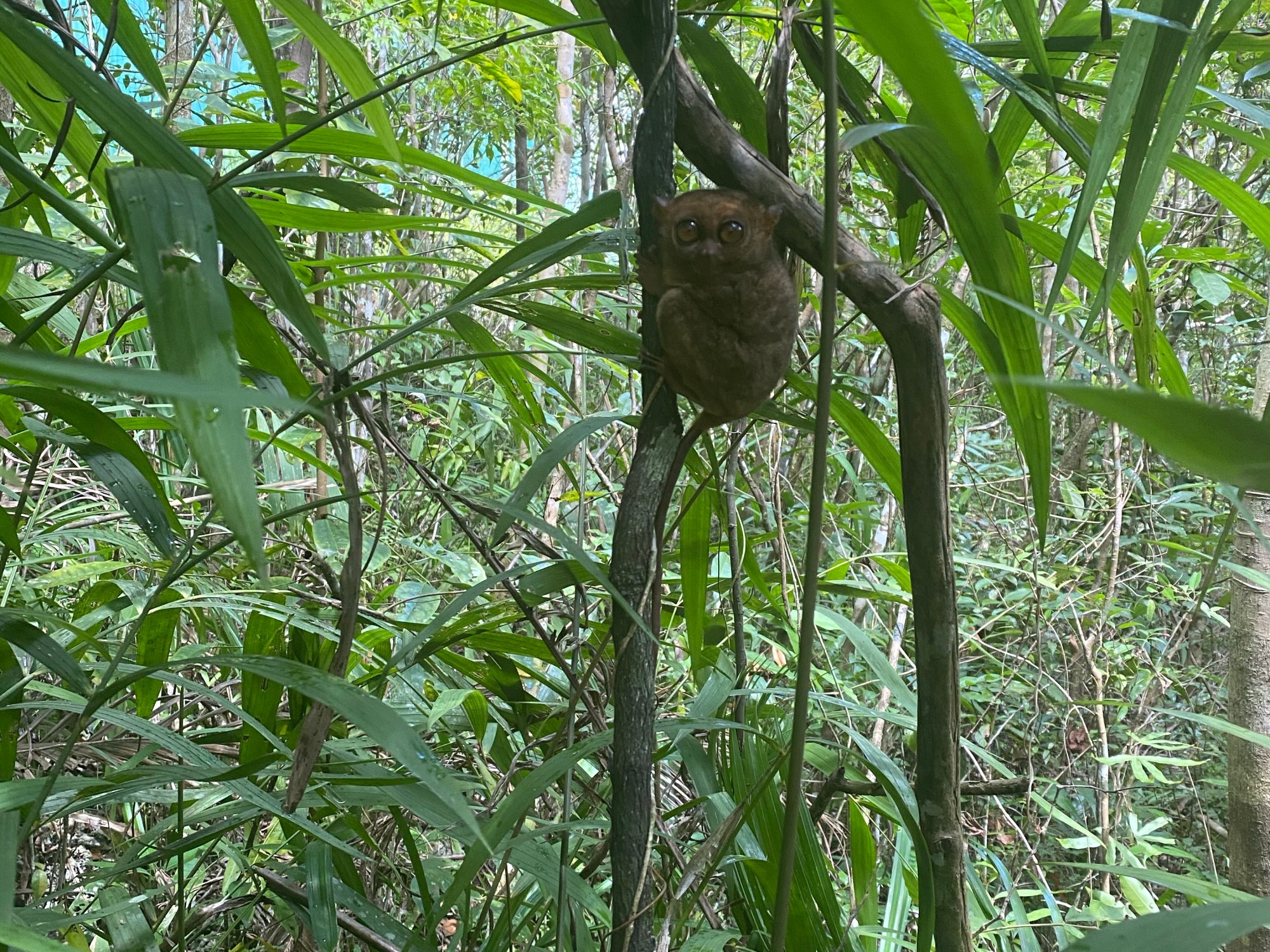 Sav: After a few wrong turns (whoops), we eventually made it to our first destination: the Bohol island Tarsier Sanctuary! We entered in total silence, after seeing at least a dozen signs shushing us. Very quietly we got a debriefing for how to conduct ourselves and then we were off! A guide took us on a short walk through a forest, weaving in and around muddy holes and clusters of bamboo shoots. She pointed out a few of the little fur balls for us to look at, and to my delight some of them were awake! For anyone that doesn’t know what a tarsier is, it’s basically a mix between a lemur and a monkey… but really it looks like a frankenanimal. It’s about the size of an apple, weighing only 0.25 lbs, it super fluffy brown fur puffs outwards, it’s spindly stick like fingers and toes grasp desperately to branches, and it has a rat like tail that is twice as long as it’s body. But the biggest thing is it’s eyes. Giant brown unmoving eyes. It can move its head 360 degrees because it can’t actually move its eyeballs at all, so it’s only ever looking straight ahead (weirdly cute and creepy at the same time). I was so beyond shocked at the size of the thing, since I had seen pictures before (never with a size reference) so I assumed they were regular monkey sized but no. LOOK.