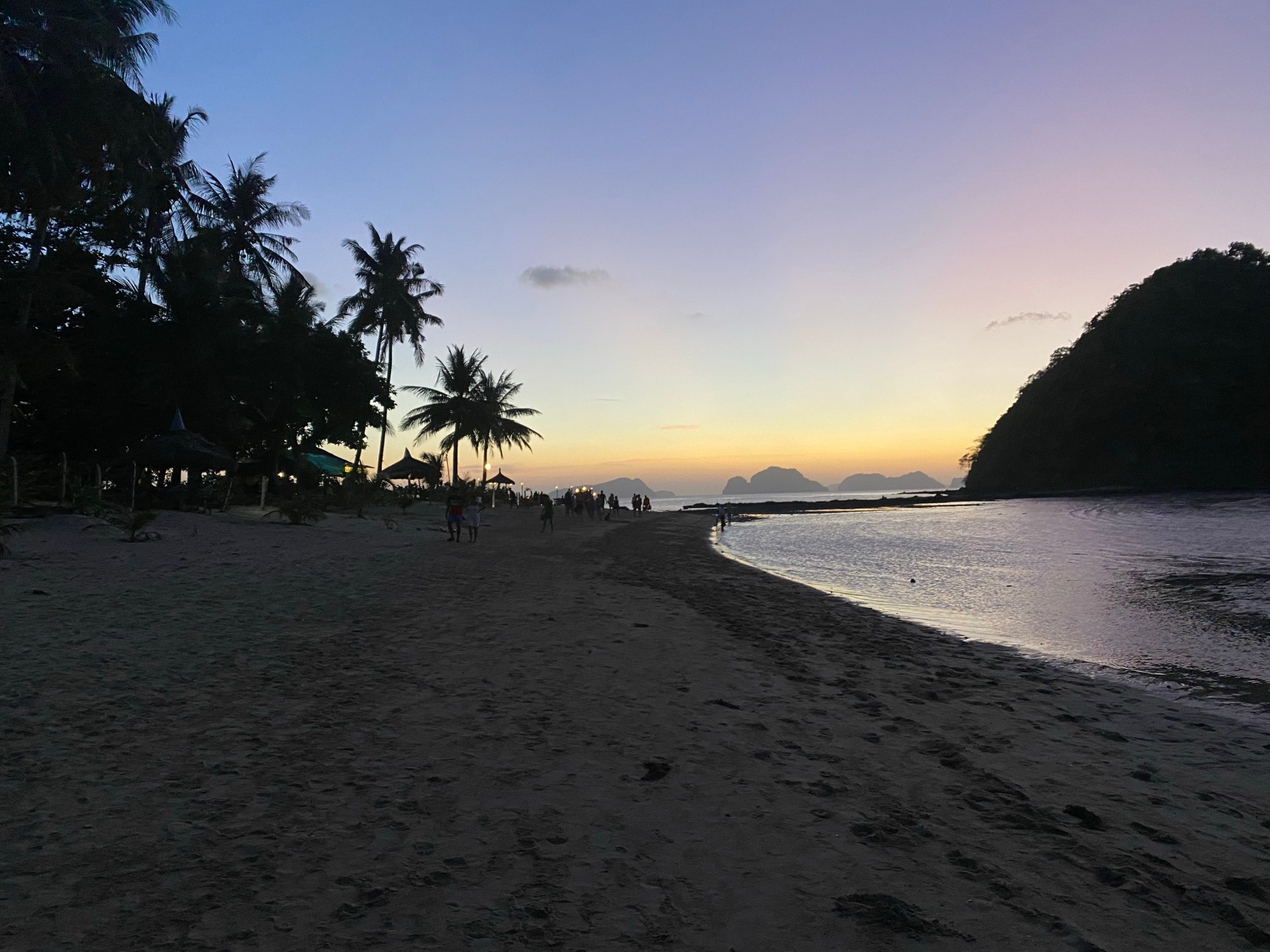 As the sun reached us, the streets began to fill with tourists and scooters and we decided to join in the chaos. I was on the hunt for flip flops, which wasn’t too hard as El Nido caters so strongly to tourists. Pretty much every building sells flip flops, as well as a plethora of beach attire. I walked barefoot for a few blocks before finding a cheap pair to do the trick. This city is a stark contrast to our other stops in the Philippines so far, where everything is so bare bones and there really is no use for silly touristy things. We decided to take advantage of the early morning and walk the length of the beach right near our hostel while it was less busy. We arrived just as the tours for the day were leaving and long lines of people were walking into waist high water towards their boats. Most of them were fully dressed! As we passed them, we were approached almost a dozen times by locals selling dry bags and necklaces, but traffic slowed as we moved further down. For two kilometres and around a bend the sand is soft and white, and the ocean is brilliant blue and warm. The photos I’ve been seeing turned out to be real!