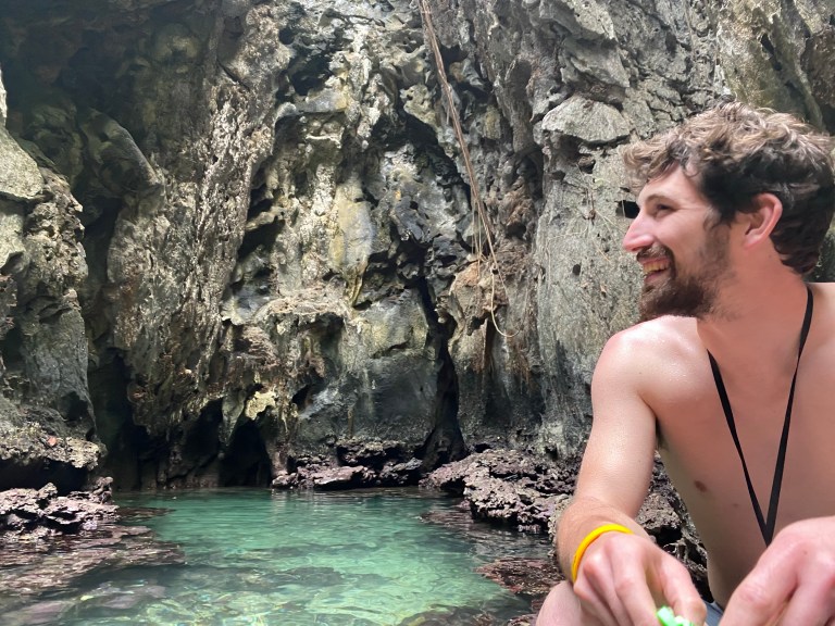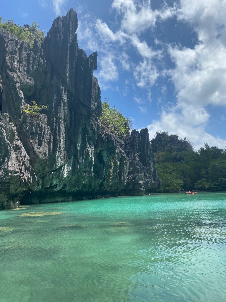 We climbed up the ladder and blasted off towards ‘The Big Lagoon’, a stop that everyone was super excited for. Let me tell you it was worth being excited about. We pulled up to the mouth of a rocky black cliff, where Max and I opted to rent a kayak-paddle-board-contraption to explore with (as opposed to swimming in through the crazy waves. Umm no thanks). I’m really glad we did because we would have missed so much of the lagoon without the access the kayak afforded us. At first we entered a channel filled with bright teal, completely clear water (also little stinging jellyfish apparently???), that eventually turned into a large dark swimming hole encircled by sheer cliffs. The limestone rocks surrounding us were otherworldly, jutting straight up out of the water they looked like many different sizes of knives all stacked together pointed upwards. We spent a long time trying to figure out what they looked like, at one point even talking about how certain sections looked like stone sentinels, or even hooded figures. Some bits could have been medieval stone castles… but every part had the same jagged knife-like protrusions. We snuck our kayak through a few caves, mouths agape around every corner at the shape of the rocks. We even saw little clear baby barracudas sneaking along the edges of the caves and in the shallower waters. I could have spent hours just anchored in the middle of the lagoon, basking in the sun and staring at the rock formations.
