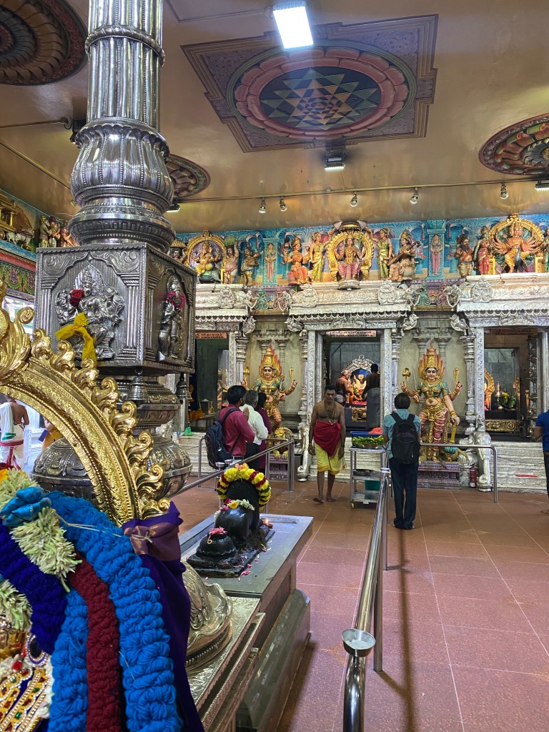 We stopped into the Hindu temple Sri Veeramakaliamman, and as it turns out Max and I had dozens of questions about Hindu religion afterwards. There were guys with baggy pants, no shirts and tons of shiny necklaces feeding bits of rice to people lined up, and bringing food offerings from them to different gods in the back section of the temple. Prayers were being chanted over a loud speaker as neon string lights blinked away around sculptures of gods. Some worshippers sat praying in the middle of the floor in the most random spots, while others sat just chatting with friends. There weren’t that many people but it felt busy, just from the variety of stuff going on.