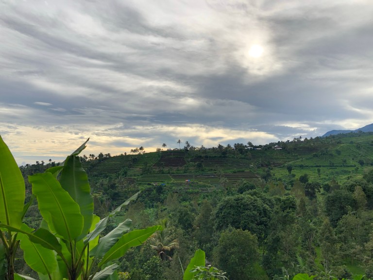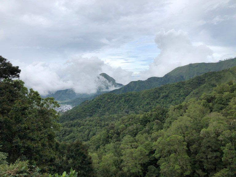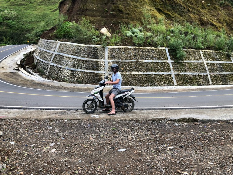 If you average out the road condition it would theoretically be fine. Long lengths of it were lovely and smooth but then out of absolutely nowhere you’d have potholes that would take out truck tires (let alone scooter tires), trees laying hidden around corners or over the crest of hills, missing chunks from landslides, and huge cracks from earthquakes. Also sometimes in the middle of nowhere for absolutely no discernible reason there were huge piles of dirt on the road. One of these such dirt piles unfortunately got the best of us as a car passed us and left little time or room to avoid the dirt. Luckily it was just dirt we slid into and not rocks or something worse. We have a few small scratches but otherwise are totally fine. We were a bit shaken up though and pressed on a little bit slower. We made it up into the mountains where it was misty and cold, and monkeys started showing up everywhere. Initially it was exciting, until we stopped at a lookout point and they turned out to be feral. It makes total sense… of course they are feral! They’re not hand fed by dudes in sarongs – but somehow we still forgot that. We left pretty quickly when they started eyeing me up in an unfriendly way and circling a bit crazily.