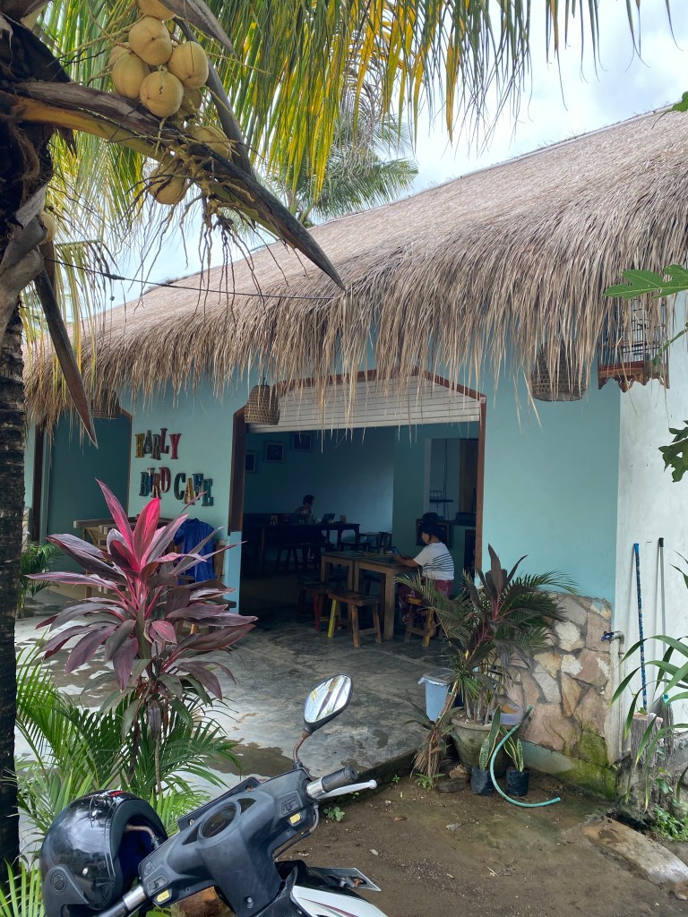 Originally we had planned to go on a guided tour today, but when booming thundershowers woke us up at 5 AM we cancelled it real fast. Instead we made our way over treacherously muddy roads (we only fell over once in the mud!) to a little blue café we’d passed by a few times called Early Bird. There was only one other patron there, there was no window panes at all in the place, just open air, and it was run by a really old Indonesian lady who didn’t speak a lick of English. Stray cats and dogs roamed around, and a brown creek ran alongside the building that was pretty full of litter. Despite this we agreed the place was comfy and served the best puff pastry meat pies we’ve ever had. Actually ever.