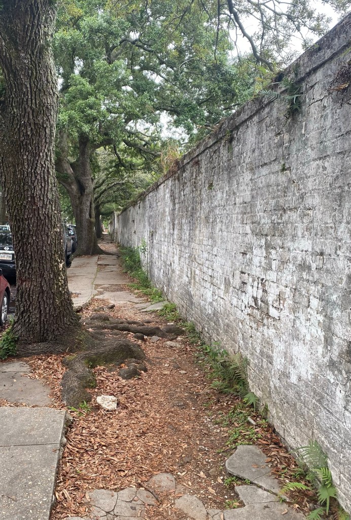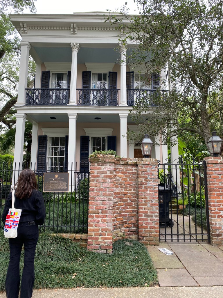 We ambled over to the old wooden tram car station and sardined ourselves onto the next available cart towards the Garden district: an old neighbourhood filled with opulent mansions and historic townhomes that was part of Pauline’s must-see list. The streets were lined with large oak trees whose roots have basically rendered the sidewalks useless in many places but only added to the charm. We very briefly considered eating at Commodores Palace for lunch but quickly squashed that idea when we saw the pressed suits, high-heels and general finery of the people going in. The fact that there were valets should have been a dead-giveaway that my ripped jeans and sneakers and Pauline’s crop top and corduroy’s were not going to cut it!
