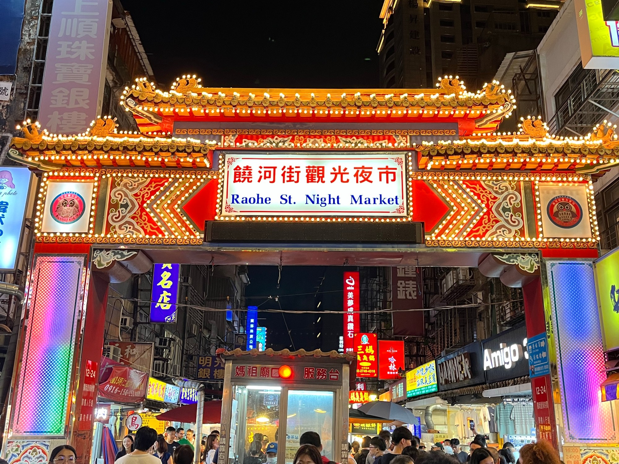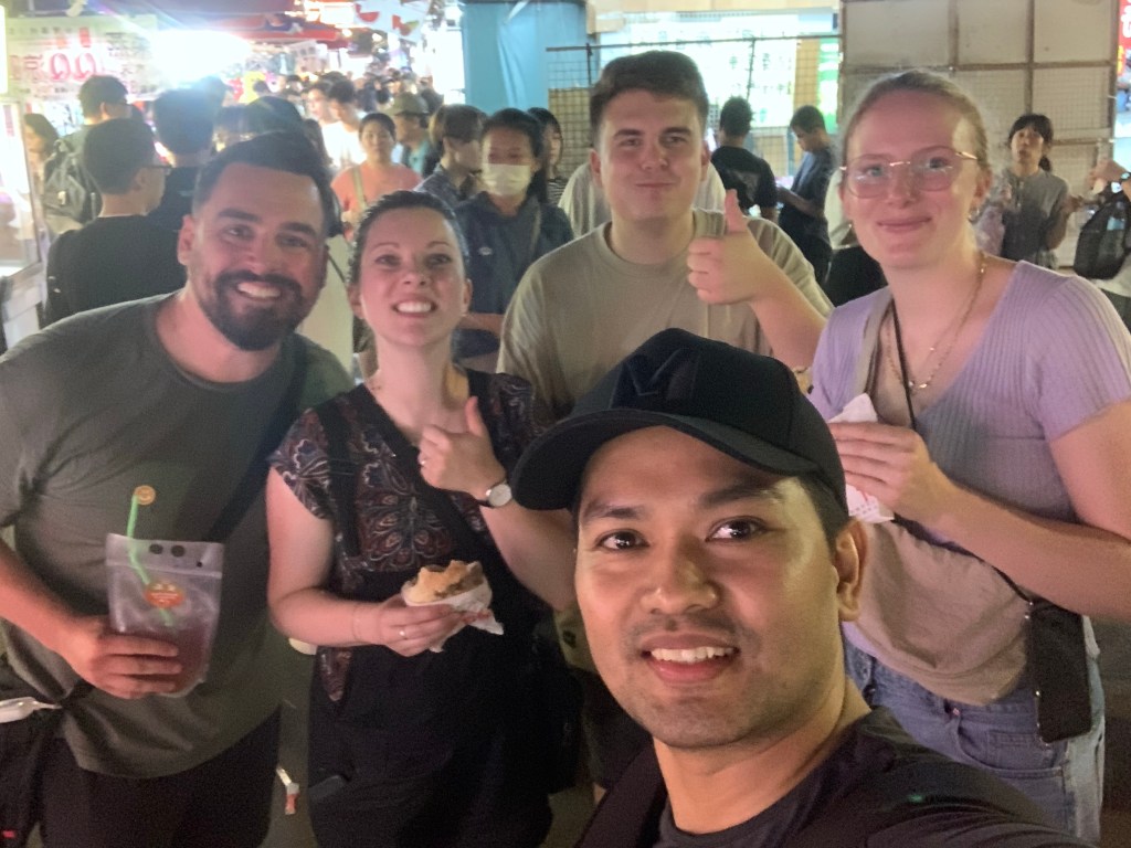 We invited them along to Raohe Night Market for dinner and to my surprise and delight they all accepted. We caught the train, chatting happily the whole way and getting to know each other until we arrived at the gates of Raohe, and gawked silently at the temple near the entrance. We dove right in and tried so many different things because with this many people you can each buy and try something new. Pepper pork buns, peanut mochi (glutinous rice dessert), fried seaweed chicken, dumplings (are we even counting anymore), sweet potato balls (like sweet and savoury hollow timbits), grilled squid, and cilantro peanut ice cream wraps were among the fare we tried.