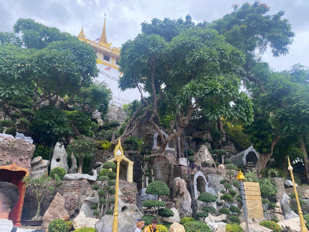 After a good three hours wandering the market we made our way over to Wat Saket: The Golden Mount. I was excited (3) as this was our first official Thai Temple. We entered through a large white gate that walled off the lower part of the temple, but even with the wall in the way the upper half was nearly impossible to miss. Craning our necks straight upward we could see a gleaming gold Pagoda at the top of the hill. In temples here you have to dress modestly (shoulders and knees covered) so I put on a button-up I’d been carrying and sweated my way up with Garrett in tow.