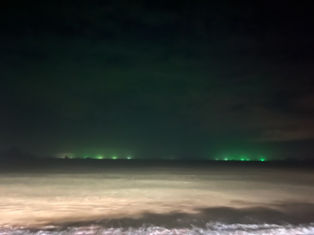 Sanni split off to pack up her stuff, as she leaves tomorrow for the islands on the east side. Annie and I scouted out some Thai food and ended up at a little homey place called Hom Mali, where I got some spicy coconut soup which is one of my favourites I think, based solely on how often I order it. Both of us were feeling pretty sore after the swimming and stiff boat seats today, so we had a massage and then strolled lazily down the road towards Ao Nang beach, grabbing some chocolate Thai pancakes on the way. Thai pancakes are just thin fried dough with different toppings basically. Sign me up. Annie was saying how she loves that basically every culture in the world has their own version of ‘fried dough with stuff’ on it, and I couldn’t agree more. It seems like you could make a travel game out of it or something: find and eat the fried dough dessert of whatever country you’re in. We sat on the stairs at the beach, chatting for awhile and looking out at the eerie soft green lights dotting the horizon. We looked it up and apparently the fishing boats here will light up the water around themselves to attract more micro-organisms, which bring in more squid at night. To me it looks like a bunch of ghost ships, and I kind of like that idea better so I’m sticking with it. Suddenly it was almost midnight somehow and we were both exhausted!