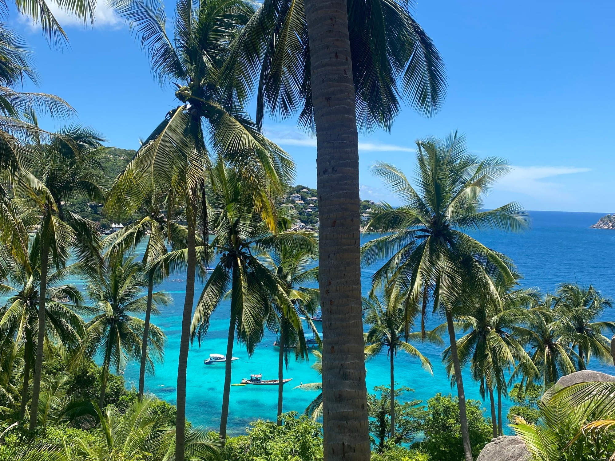 it just never seems totally worth it. This viewpoint though? Different story. I climbed over the final boulder and looked down into two NEON BLUE bays. Like I actually said out loud “that doesn’t even look like a real colour.” I could see fishing boats and kayaks floating around, casting a shadow right down to the ocean floor below. That’s how clear the water was – I could see a boats shadow from the top of the lookout!!