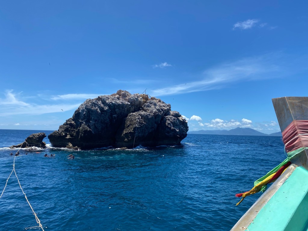 The current was so strong on one side of the rock that we couldn’t even get around the corner to look, so we just did a lot of back and forthing at different depths along the less intense side. When we surfaced after the fist dive, the current was so fast and the waves were so big I had to use every ounce of energy I had just to make it back to the boat. Both Nina and I were pretty gassed by the time we actually made it back and at one point, despite kicking and swimming pretty hard we were getting further from where we were trying to go. Alright ok cool this is fine. Just keep swimming swimming swimming. WHAT DO WE DO WE SWIIIIM.