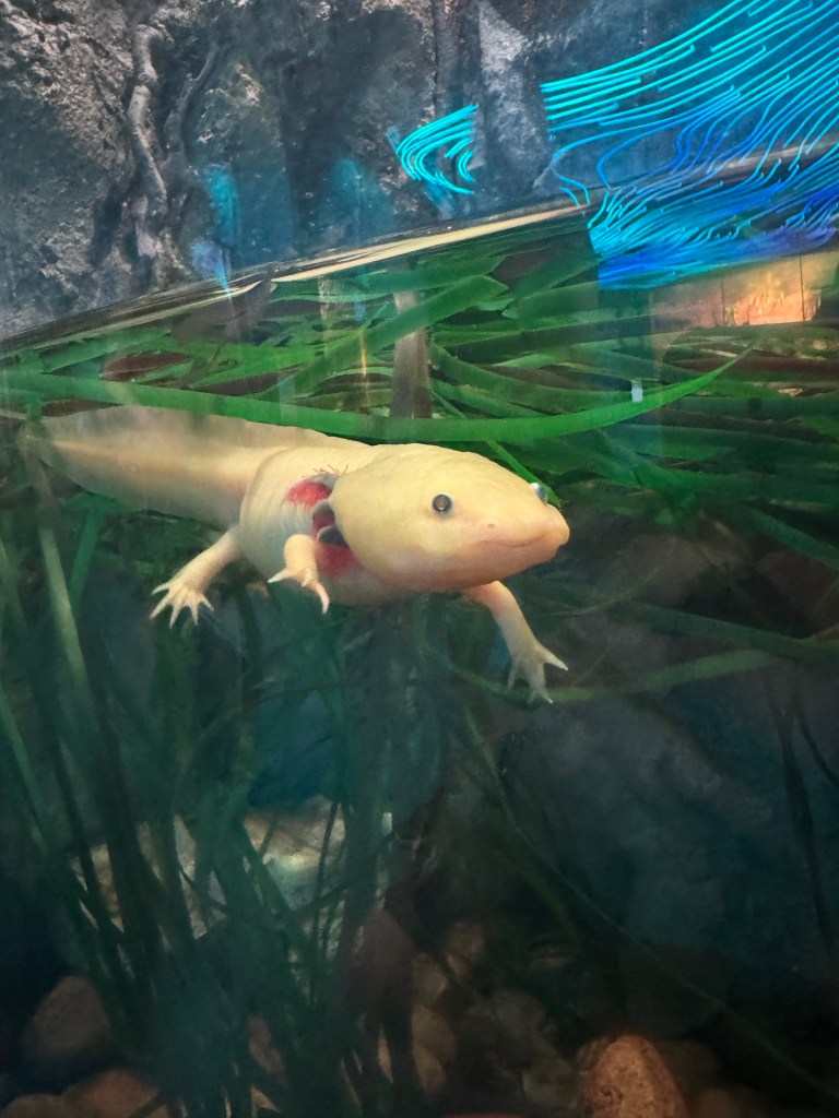 - A slippery little Axolotl smiling at us through his tank.