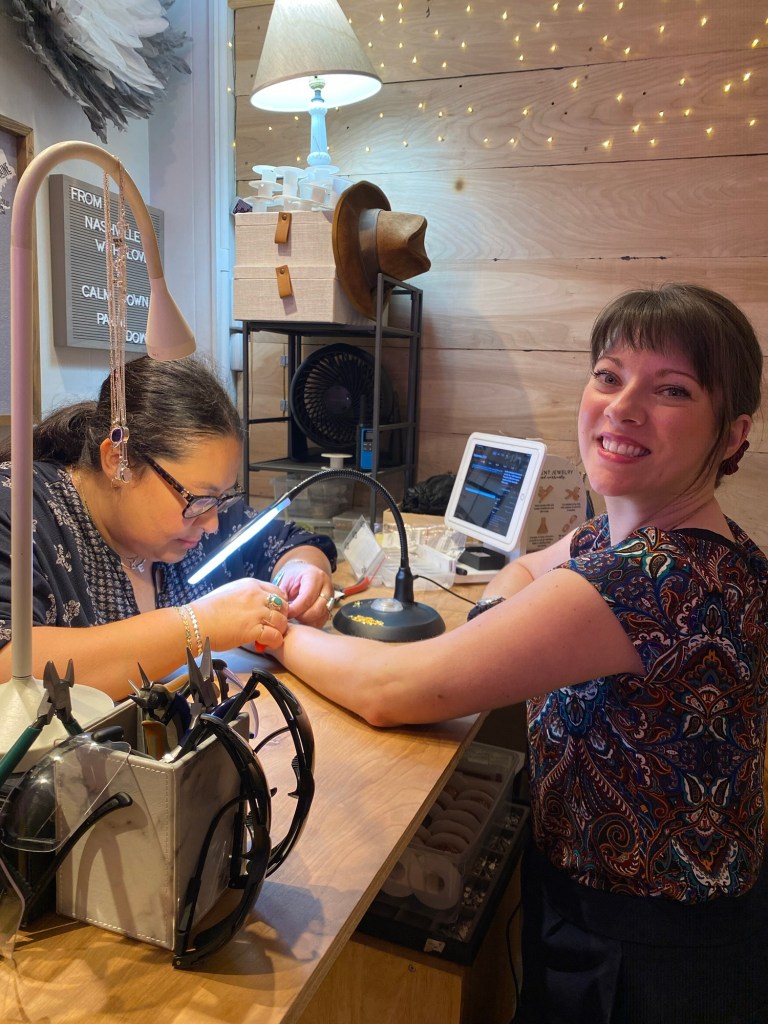 When Kat and I were in Seattle last year we got permanent bracelets welded on to our wrists for my birthday, and we love them so much that we decided another was in order. While quirky, the ladies at the shop were so patient and friendly as Kat and I waffled over which chains to get. Eventually, after much tippy tapping from foot to foot on my part, we got the chains sparked on.