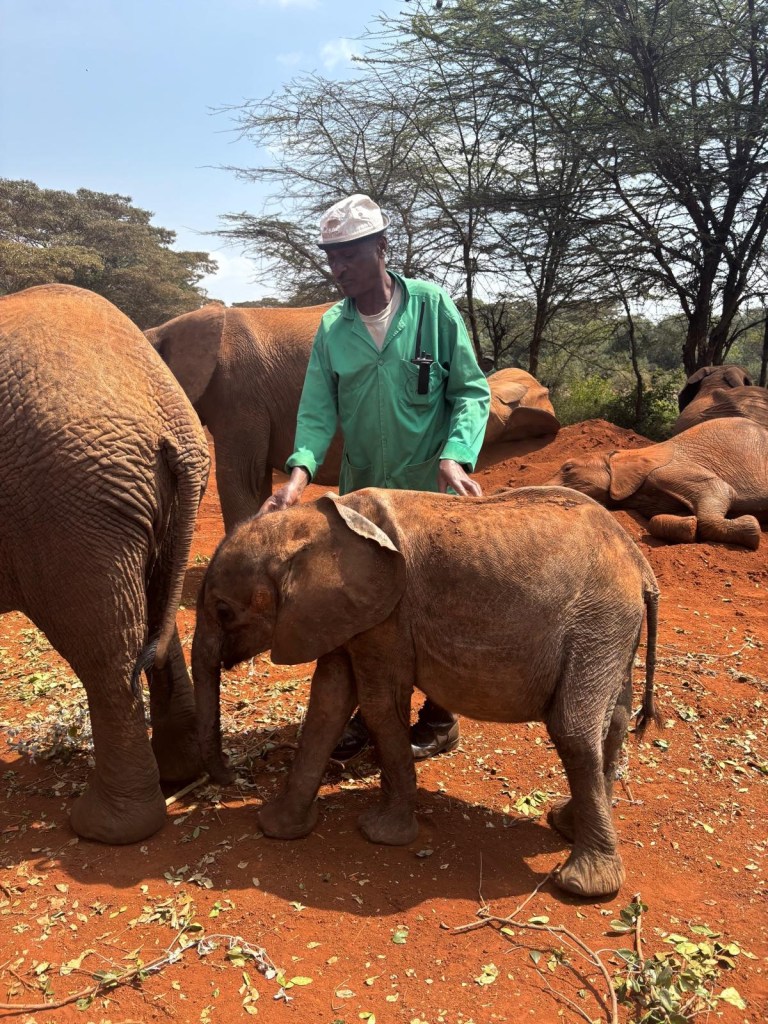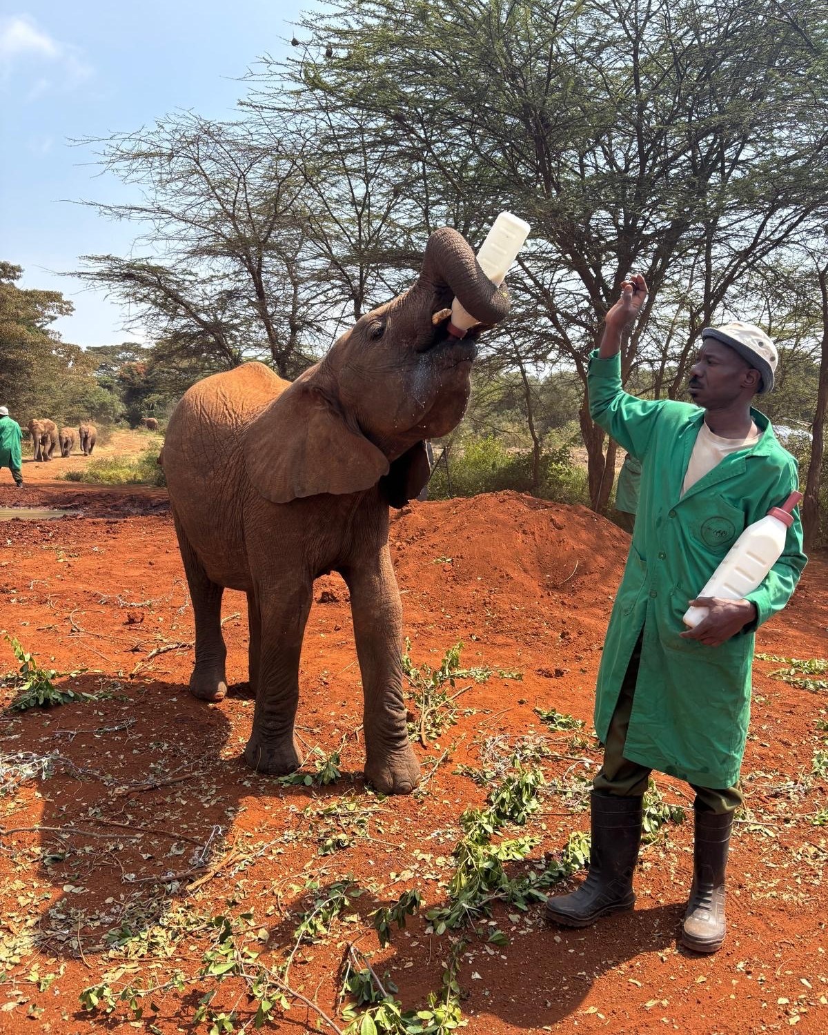 The foundation hosts short viewings of the babies once a day and gives a talk on the founders and the way they raise funds. I have to tell you though… I’m going to need to look all that info up later because I could not concentrate at all while 14 baby elephants stampeded down the hill towards us. Tooting their horns and rushing in for the bottles of baby formula the handlers had at the ready, they ranged from 4 months to 3.5 years old. I did catch that no elephant stays at the sanctuary for longer than 3 years, or past age 4 if they are healthy and ready to be reintroduced to the wild. They told us each individual elephants rescue story, most of which were due to animal-human conflict rather than natural causes. The babies all ate food, played in the bright red dirt, sloshed in a little watering hole and interacted with each other just feet from us!