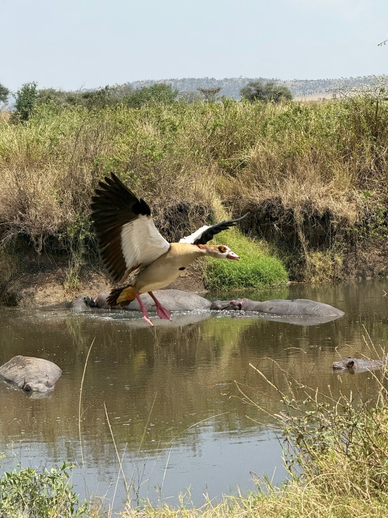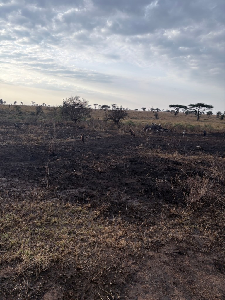 A massive expanse of plains stretched out in every direction as the sun rose over the acacia trees. Nobody slept super well as hyenas were snuffling around our tents in the middle of the night, and lions were huffing starting around 4 AM. We basically dropped strong coffee and anti-malaria pills down our throats and rushed to the trucks to catch sunrise. Right before leaving Mascha and I accidentally stood on an ant hill and ended up literally starting the day with ants in our pants, biting for the first couple of hours of the drive. So comfy. Love that for us. Even with the ants, we were seeing impalas, giraffes, heartbeasts and gazelles abound in the early morning light but then we started smelling something… rank.