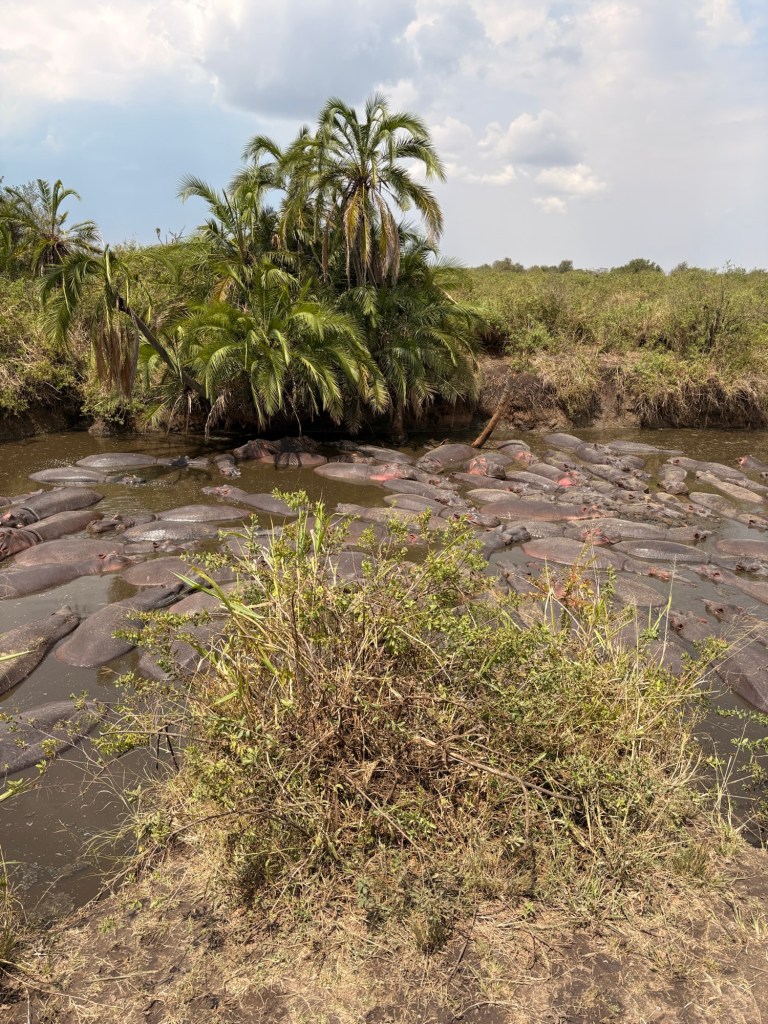 Yesterday we saw an area that could have contained hippos, but we didn’t have enough time to fully investigate so we headed over there this morning, and were rewarded with over 100 hippos snoozing in the river. ONE HUNDRED. They can only hold their breath for 5 or 6 minutes, so every so often a hippo would raise its head out of the water, huff, and sink back down against the other squishy bodies. Sometimes one would make a ‘wheeze honk’ sound and get a few others going in a cacophonous response. I had no idea they stayed in such large groups… which are delightfully known as ‘thunders’.