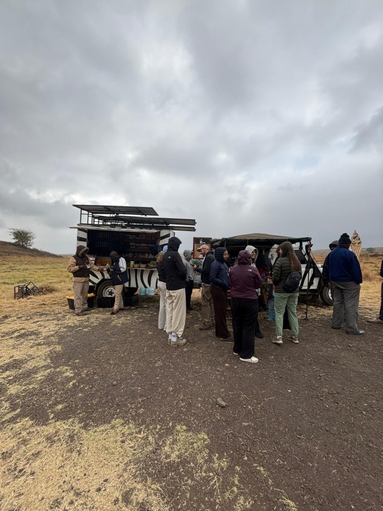 Something I did not expect at all was that there was a small coffee cart painted in zebra stripes smack dab in the middle of the crater. Why is this here!? It was oddly charming and a little confusing to drive up and grab a warm latte in the middle of a foggy grassland. It reminded me of something out of a Wes Anderson movie.