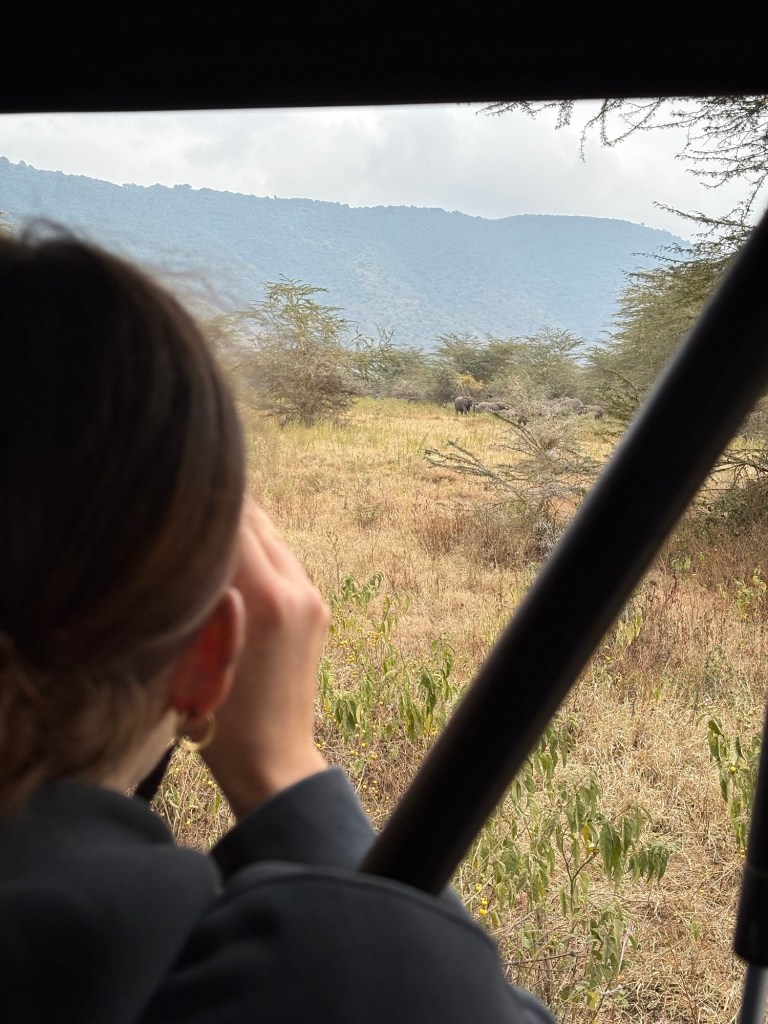We went down over 600 meters in elevation out of the fog and were greeted with a view of a massive salt lake, sparkling in the morning sun that was peeking through the cloud cover. The golden light was shining onto the yellow grasslands, creating a stark contrast to the herds of animals below.