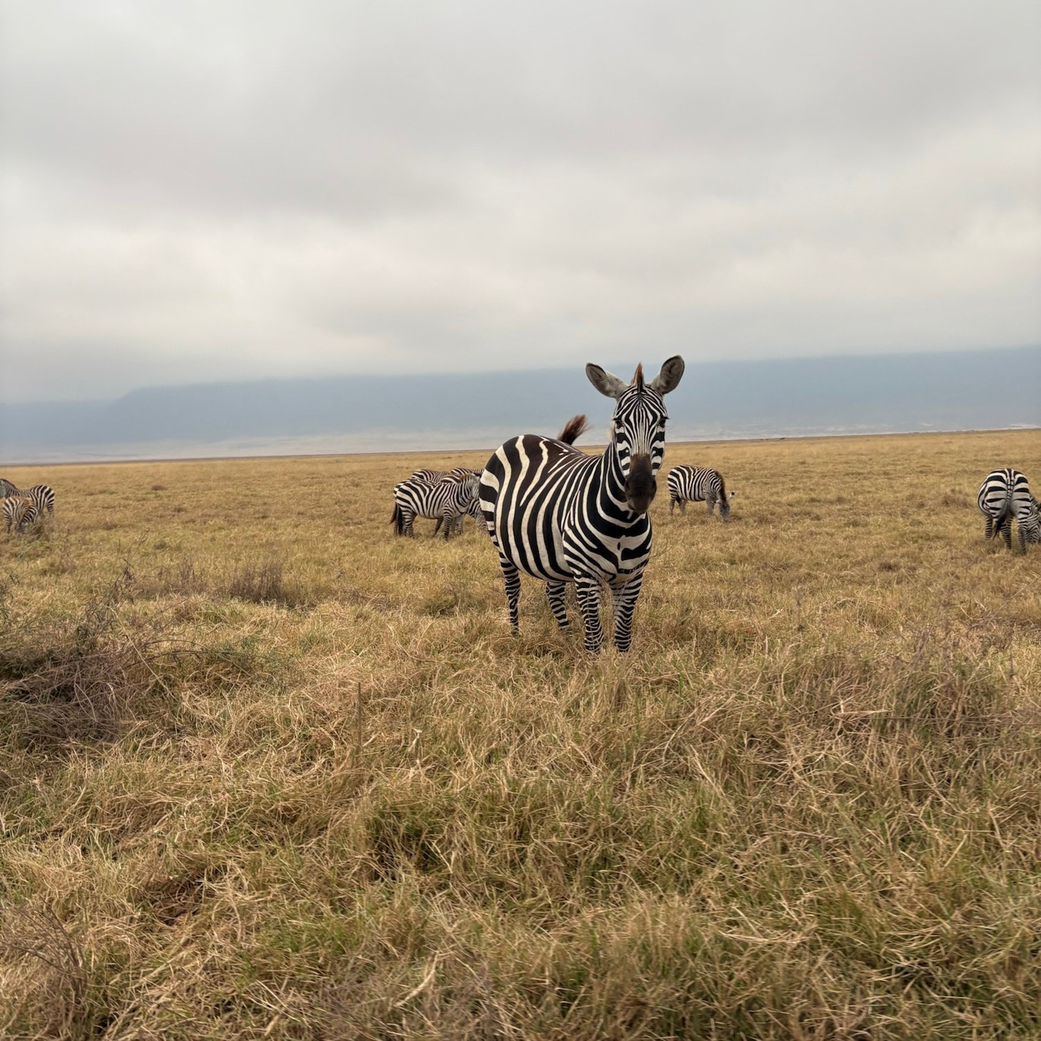 We went down over 600 meters in elevation out of the fog and were greeted with a view of a massive salt lake, sparkling in the morning sun that was peeking through the cloud cover. The golden light was shining onto the yellow grasslands, creating a stark contrast to the herds of animals below.