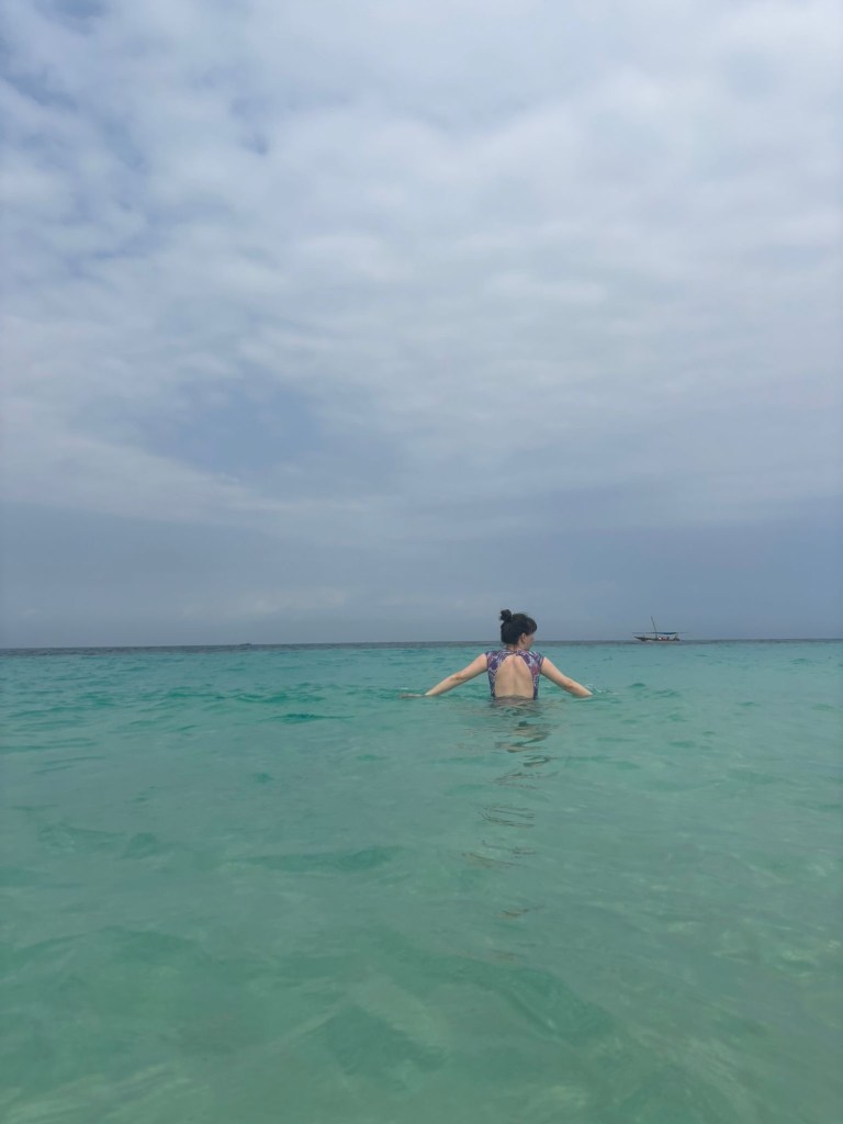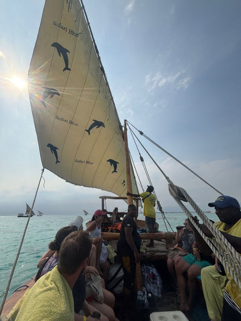 After a bumpy back road bus ride we made it to a white sand beach and were ushered out into the ocean, walking up to our thighs towards a wooden dhow boat. These boats reminded me a bit of the long tail boats in Thailand, except they have massive sails to conserve fuel when the wind is right.
